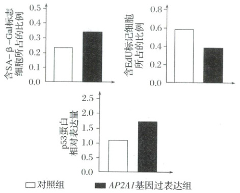 3. (2025·湖北卷,T13)科研人员以SA-β-Gal作为细胞衰老的分子标志,以EdU作为细胞DNA复制的标记,揭示了AP2A1蛋白通过调节p53蛋白表达量来影响细胞衰老的机制,实验结果如下图。下列叙述错误的是 (