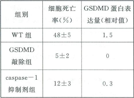 2. (2025·黑龙江大庆模拟)细胞焦亡是一种由基因调控的程序性死亡,可引发炎症反应。脂多糖(LPS)可引发脑内皮细胞焦亡并破坏血脑屏障,现分别用LPS处理WT组(正常脑内皮细胞)、GSDMD敲除组(GSDMD基因敲除的WT细胞)及caspase-1抑制剂组(WT细胞加入caspase-1抑制剂),并检测细胞死亡率和GSDMD蛋白表达量(相对于无LPS处理WT组的数据统计),结果如下表所示。下列说法错误的是(
