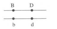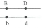 (2)统计结果显示,该志愿者关于B、b和D、d 的配子比例为Bd:bD:BD:bd=2:2:1:1,某遗传病受等位基因B、b和D、d控制,且只要有1个显性基因就不患该病。该志愿者与某女性婚配,预期生一个正常孩子的概率为17/18,即生出患病孩子bbdd的概率为1/18=1/6×1/3,说明该女性产生bd的卵细胞的比例为1/3,则BD配子比例也为1/3,二者共占2/3,均属于非重组型配子,说明该女性体内的相关基因处于连锁关系,即应该为B和D 连锁,b和d连锁,据此画出该女性的这2对等位基因在染色体上的相对位置关系图如下: