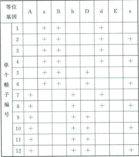 (1)题中显示,表中该志愿者12个精子的基因组成种类和比例与该志愿者理论上产生的配子的基因组成种类和比例相同,结合表中信息可以看出,基因型为aB:Ab=1:1,因而可推测,等位基因A、a 和B、b位于一对同源染色体上,因而其遗传“不遵循”自由组合定律。表中显示含有e的配子和不含e 的配子的比例表现为1:1,因而可推测e基因位于X或Y染色体上,根据表中精子类型和比例可以看出,A、a与E、e这两对等位基因表现为自由组合,因而能排除等位基因A、a位于X、Y染色体同源区段上。
