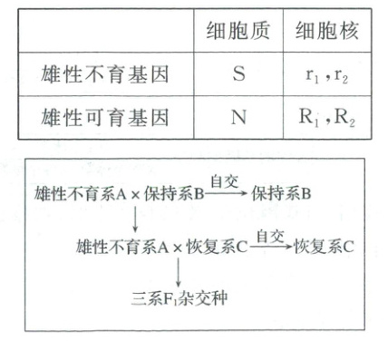 (2)据题意“雄性不育系通过与保持系杂交维持雄性不育品系”,结合基因型S(r₁r₁r₂r₂)的水稻表现为雄性不育,只能作为母本,可以提供质基因S,需要与可育雄性植株杂交,故保持系需含有质基因N,而依据题干中“保持系和恢复系能够通过自交进行自身品系的保持”说明保持系为纯合子,为了得到子代即雄性不育品系S(r₁r₁r₂r₂),则保持系基因型为N(r₁r₁r₂r₂)。
