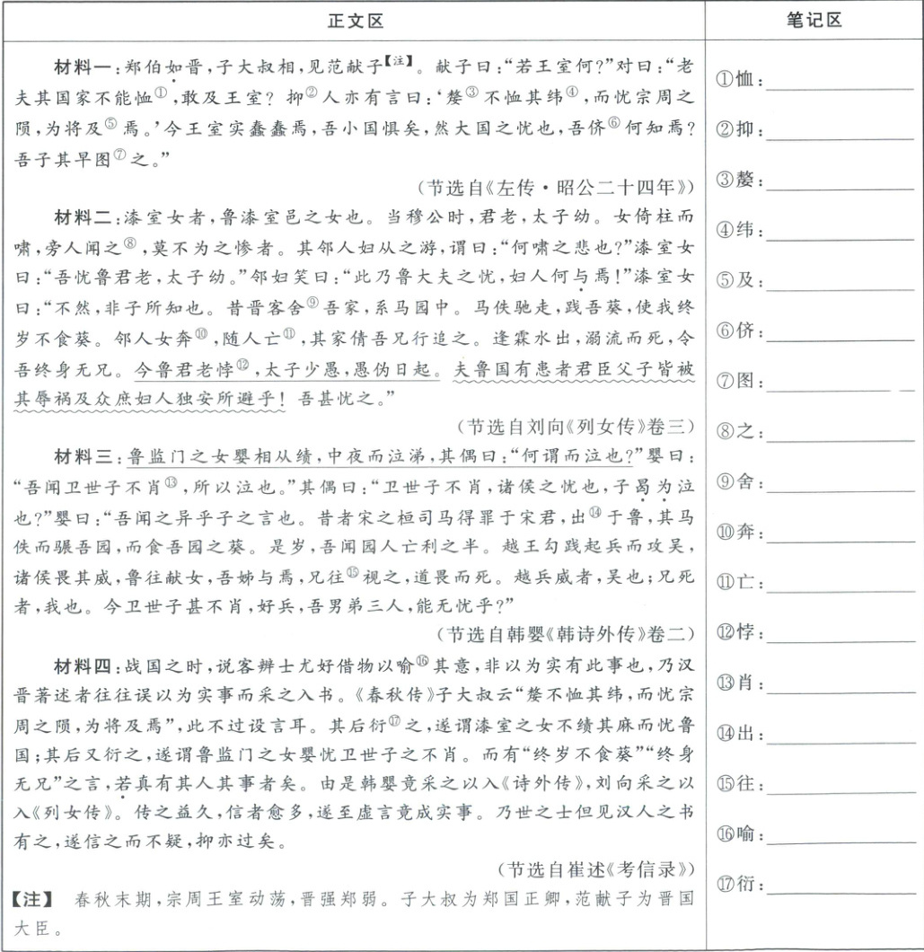 3.解析:本题考查学生理解和分析文章内容的能力。B.“漆室女告知原因……我终身没有了兄长”错误。材料二中“漆室女曰:‘吾忧鲁君老,太子幼’”是对邻妇“何啸之悲也?”之问的回答,这也正是她“倚柱而啸,啸声如此悲惨”的原因。而后文她所说的“……践吾葵,使我终岁不食葵……令吾终身无兄”是对邻妇“此乃鲁大夫之忧,妇人何与焉!”的反驳,是她为解释观点所举的具体事例,并非她“倚柱而啸,啸声如此悲惨”的原因。故选B。