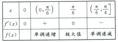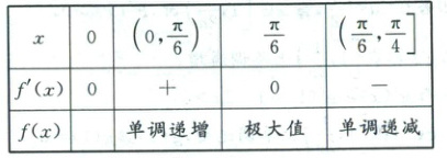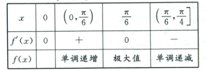 解法二 第1步:求$f^{\prime}(x)$ 因为$f(x)=5\cos x - \cos 5x$,所以$f^{\prime}(x)= - 5\sin x + 5\sin 5x$. 第2步:对$f^{\prime}(x)$提取公因式,进行分析 $f^{\prime}(x)=5(\sin x\cos 4x + \sin 4x\cos x - \sin x)=5\sin x(\cos 4x + 4\cos^2 x · \cos 2x - 1)=5\sin x · 4\cos^2 x(1 - 4\sin^2 x)$, 易得当$x \in \left[0, \frac{\pi}{4}\right]$时,$5\sin x · 4\cos^2 x \geq 0$,令$f^{\prime}(x) > 0$,得$x \in \left(0, \frac{\pi}{6}\right)$, 令$f^{\prime}(x) < 0$,得$x \in \left(\frac{\pi}{6}, \frac{\pi}{4}\right]$. 第3步:写出$x$,$f^{\prime}(x)$,$f(x)$的关系 所以当$x$变化时,$f^{\prime}(x)$,$f(x)$的关系如表所示: