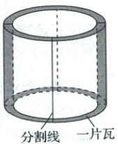 例 2 (1)(2025·北京东城区模拟)《天工开物》是我国明代科学家宋应星所著的一部综合性科学技术著作,书中记载了一种制造瓦片的方法。某校高一年级计划实践这种方法,为同学们准备了制瓦用的黏土和圆柱形的木质圆桶,圆桶底面外圆的直径为 $20\ cm$,高为 $20\ cm$。首先,在圆桶的外侧面均匀包上一层厚度为 $2\ cm$ 的黏土,然后,沿圆桶母线方向将黏土层分割成四等份(如图),等黏土干后,即可得到大小相同的四片瓦。每位同学制作四片瓦,全年级共 $500$ 人,需要准备的黏土量(不计损耗)与下列哪个数字最接近。(参考数据:$\pi\approx 3.14$)(