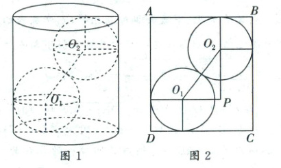 2.5 设铁球半径为$r\mathrm{cm}$,若两个铁球的球心在竖直方向 上,且分别与两个底面相切,则铁球球心与圆柱上、下底面 的距离均为$r$,此时铁球的半径为$\frac{9}{4}\mathrm{cm}$. 当两球球心不在竖直方向上时,设两个铁球的球心分别为 $O_1$,$O_2$,此种情况下,当铁球半径最大时,如图1所示,圆柱 与两铁球的轴截面如图2所示,其中$ABCD$为圆柱的轴截 面,$O_2P\perp AB$,$O_1P\perp AD$,则有$O_2P=9-2r$,$O_1P=8-2r$, $O_1O_2=2r$,则有$(2r)^2=(8-2r)^2+(9-2r)^2$,即$4r^2-$ $68r+145=0$, 即$(2r-29)(2r-5)=0$,解得$r_1=14.5$(舍去),$r_2=2.5$.