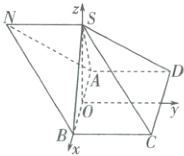 易得$A(-1,0,0)$,$B(1,0,0)$,$C(1,1,0)$,$D(-1,1,0)$,$S(0,0,\sqrt{2})$,$N(0,-1,\sqrt{2})$,所以$\overrightarrow{SN} = (0,-1,0)$,$\overrightarrow{SC} = (1,1,-\sqrt{2})$,$\overrightarrow{AB} = (2,0,0)$,$\overrightarrow{AN} = (1,-1,\sqrt{2})$,设平面$SNC$的法向量为$\boldsymbol{n} = (x,y,z)$,则$\begin{cases}\boldsymbol{n}·\overrightarrow{SC} = 0\\\boldsymbol{n}·\overrightarrow{SN} = 0\end{cases}$所以$\begin{cases}x + y - \sqrt{2}z = 0\\-y = 0\end{cases}$令$z = 1$,得$x = \sqrt{2}$,即$\boldsymbol{n} = (\sqrt{2},0,1)$,设平面$ABN$的法向量$\boldsymbol{m} = (a,b,c)$,则$\begin{cases}\boldsymbol{m}·\overrightarrow{AB} = 0\\\boldsymbol{m}·\overrightarrow{AN} = 0\end{cases}$所以$\begin{cases}2a = 0\\a - b + \sqrt{2}c = 0\end{cases}$令$c = 1$,则$b = \sqrt{2}$,即$\boldsymbol{m} = (0,\sqrt{2},1)$,设平面$SNC$与平面$ABN$所成夹角为$\theta$,所以$\cos\theta = |\cos\langle\boldsymbol{n},\boldsymbol{m}\rangle| = \frac{|\boldsymbol{n}·\boldsymbol{m}|}{|\boldsymbol{n}|·|\boldsymbol{m}|} = \frac{1}{\sqrt{3}×\sqrt{3}} = \frac{1}{3}$,所以$\sin\theta = \sqrt{1 - \cos^2\theta} = \sqrt{1 - \frac{1}{9}} = \frac{2\sqrt{2}}{3}$,即平面$SNC$与平面$ABN$所成夹角的正弦值为$\frac{2\sqrt{2}}{3}$.