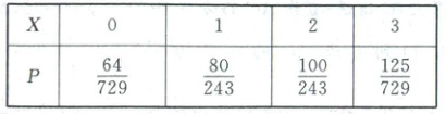 所以$X$的数学期望$E(X)=0×\frac{64}{729}+1×\frac{80}{243}+2×\frac{100}{243}+3×\frac{125}{729}=\frac{5}{3}$.