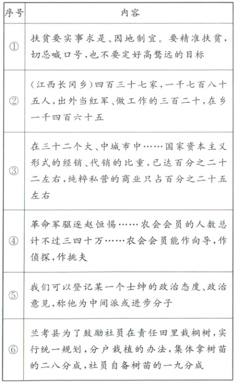启示:根据材料贯穿革命、建设、改革时期可知,调查始终服务于核心任务(如扩红、改造、脱贫),确保政策针对性说明中国共产党坚持问题导向,服务核心任务;根据材料②“长冈乡人口统计”可知深入基层,使决策符合群众利益,说明中共始终贯彻群众路线;根据材料①“切忌好高鹜远”可知拒绝主观主义(如扶贫拒绝“数字脱贫”),以调研校准政策偏差,说明中共注重实事求是;根据材料并结合所学知识可知,从手工登记(材料②)到大数据扶贫(材料①),体现中共创新方法手段,提升科学决策水平;结合所学知识可从党建传统角度分析:1941 年《中共中央关于调查研究的决定》到 2023 年全党大兴调研,推动调研长效化,说明中共强化制度保障。
