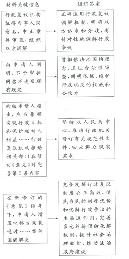 解析:第一步,审设问。本题知识限定为《政治与法治》,要求说明行政复议制度是如何推动政府兼顾实现行政目标和保护相对人利益的。第二步,审材料。解答本题应该从材料中“行政复议制度”的具体实施过程入手,分析其对政府和行政相对人发挥作用的具体路径。据此结合材料,链接相关教材术语,组织答案即可。具体分析如下: