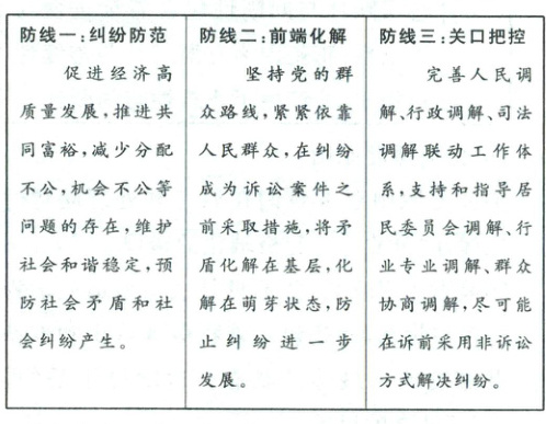 习近平总书记指出:“我国国情决定了我们不能成为‘诉讼大国’。我国有 14 亿人口,大大小小的事都要打官司,那必然不堪重负!”我国从诉讼产生的源头——社会矛盾和社会纠纷着手,构筑三道防线,减少诉讼增量。
