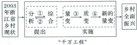(2)题目要求在图片相应位置概括“千万工程”提出与实施过程中所运用到的思维方法的具体表现。涉及分析和综合的辩证关系,量变与质变的辩证关系原理内容,运用基础知识简单分析即可进行作答。