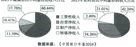 [典例2] A 本题要结合城镇居民不同收入占比和农村居民不同收入占比做出合理推断,根据图可以得出城镇居民转移净收入占比为17.76%,农村居民转移净收入占比为21.01%,国民收入的再分配主要指转移支付(转移净收入),以上数据表明农村居民收入更依赖再分配,①符合题意。就业情况直接影响工资性收入。城镇居民工资性收入占比为60.44%,远高于农村居民(42.24%),因此城镇居民更容易受到就业情况的影响,③符合题意。城镇居民工资性收入占比为60.44%,高于农村居民的42.24%,因此城镇居民工资性收入占比更高。工资性收入包括按劳分配、按劳动要素分配等形式,无法直接推断出城镇居民按劳分配收入占比更高,②不选。提高农村居民财产性收入占比,有助于优化农村居民内部收入结构,但无法直接推导出缩小城乡居民收入差距,④不选。