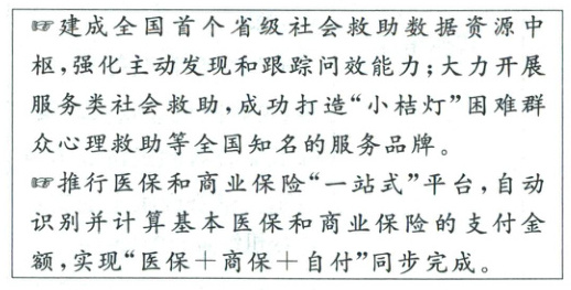 )①提升救助智能化水平→提高社会救助质效→兜好困难群众基本生活底线 ②打造服务救助品牌→提供高层次社会保障→增强救助对象自我发展能力 ③医保和商业保险有效衔接→提升资金结算效率→减轻人民群众就医负担 ④加大救助投入→增加困难群众转移性收入→健全分层分类社会救助体系