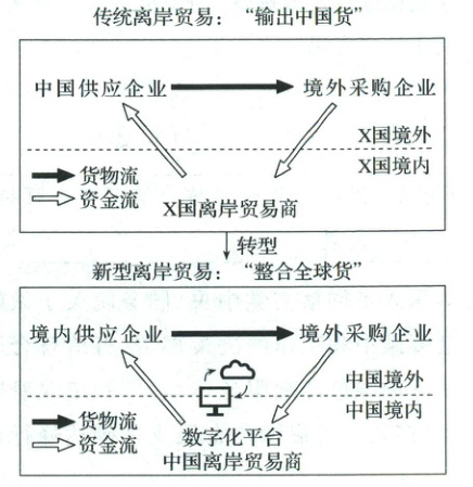 [典例 5] (2025·北京·高考真题)2025 年,“新型离岸贸易”一词首次亮相国务院《政府工作报告》。离岸贸易的特点为资金流过境而货物流不过境。如下图所示,中国企业借助数字化平台实现了从传统离岸贸易中“输出中国货”到新型离岸贸易中“整合全球货”的角色转变。