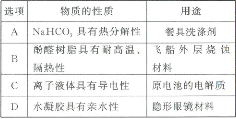 7.A NaHCO₃可用作餐具洗涤剂是因为NaHCO₃水解使溶液呈碱性可以使油污水解,与其热分解性无关,A符合题意;酚醛树脂具有耐高温的性质,可用作飞船外层烧蚀材料,B不符合题意;离子液体中存在可自由移动的阴、阳离子,具有导电性,可作为原电池的电解质,C不符合题意;水凝胶是一种亲水性物质,广泛应用于隐形眼镜中,D不符合题意。