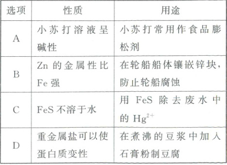 9.B 小苏打即碳酸氢钠受热分解生成二氧化碳气体使得糕点疏松,故常用作食品膨松剂,与小苏打溶液呈碱性无关,A错误;轮船外壳镶嵌锌块,是牺牲阳极法保护轮船船体,Zn的金属性强于Fe,Zn做负极,Fe做正极,可防止Fe腐蚀,B正确;FeS和汞离子反应转化为硫化汞沉淀,故能除去重金属汞离子,C错误;煮沸的豆浆中加入石膏粉制豆腐,是石膏可以使蛋白质胶体发生聚沉,而不是重金属盐可以使蛋白质变性,D错误。