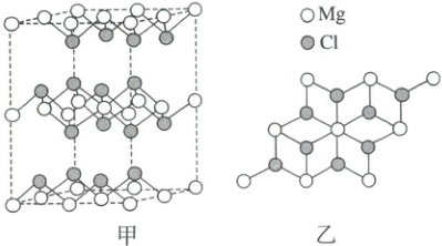 1.D 同周期元素从左到右电负性逐渐增强,电负性:$Mg<Cl$,A项正确;镁为金属元素,单质$Mg$为金属晶体,B项正确;由图甲可知,该晶体中存在层状结构,则层与层之间存在范德华力,C项正确;由图乙中结构可知,与$Mg^{2+}$距离最近且相等的$Cl^-$有6个,故$Mg^{2+}$的配位数为6,D项错误。