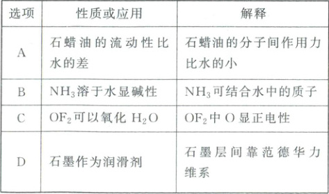2.A 石蜡油的成分主要是高碳烷烃,相对分子质量大,分子间作用力大,导致粘度大,因此石蜡油流动性比水小的原因是分子间作用力比水分子间作用力大,A错误;$NH_{3}$中N有一对孤电子对,能与水提供的$H^{+}$结合,从而释放$OH^{-}$,因此$NH_{3}$溶于水显碱性,B正确;F的电负性大于O,$OF_{2}$中F显负电性,O显正电性,$H_{2}O$中O显负电性,$H_{2}O$中O容易转移电子给$OF_{2}$中O,因$OF_{2}$可以氧化$H_{2}O$,C正确;石墨是层状结构,石墨层间靠范德华力维系,范德华力较弱,导致层与层之间容易滑动,故石墨具有润滑性,D正确;答案选A。