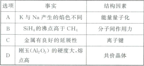 1.C K和Na产生的焰色不同,是因为能量是量子化的,二者核外电子从高能级跃迁回低能级释放的能量不同,A正确;$SiH_{4}$和$CH_{4}$均为分子晶体,$SiH_{4}$的相对分子质量更大,分子间作用力更强,故$SiH_{4}$的沸点高于$CH_{4}$,B正确;当金属受到外力作用时,晶体中的原子层间会发生相对滑动,但不会改变原来的排列方式,没有化学键的断裂与形成,所以金属有良好的延展性与离子键无关,C错误;$Al_{2}O_{3}$为共价晶体,故其硬度大、熔点高,D正确。