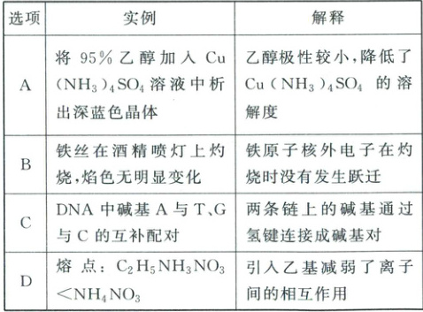 3.B 将$95\%$乙醇加入$Cu(NH_{3})_{4}SO_{4}$溶液中析出深蓝色晶体,原因是乙醇分子的极性小,加入乙醇后溶剂的极性减小,降低了$Cu(NH_{3})_{4}SO_{4}$的溶解度,故A正确;铁丝在酒精喷灯上灼烧,焰色无明显变化,并不是铁原子核外电子在灼烧时没有发生跃迁,而是放出的光子频率不在可见光频率范围内,故B错误;O元素、N元素的电负性较大,能与氢形成分子间氢键,DNA中的碱基A与T、G与C的互补配对是通过氢键来实现的,故C正确;硝酸铵中铵根离子和硝酸根离子间存在离子键,铵根离子其中一个H被乙基替代,引入乙基减弱了离子间的相互作用,所以熔点:$C_{2}H_{5}NH_{3}NO_{3}<NH_{4}NO_{3}$,故D正确;答案选B。