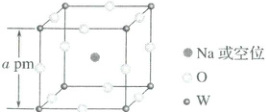 1.B 由题图可知,W位于O形成的八面体空隙中,故与W最近且等距的O有6个,A正确;$\mathrm{Na_xWO_3}$中$\mathrm{Na}$为$+1$价,O为$-2$价,由化合物中各元素化合价代数和为零可知,$x$增大,W的平均价态降低,B错误;由均摊法可知,W位于晶胞顶点,个数为$8 × \frac{1}{8}=1$,O位于晶胞棱心,个数为$12 × \frac{1}{4}=3$,当$x=0.5$时,晶胞中$\mathrm{Na}$的个数为$0.5$,则晶体密度为$\frac{184+16 × 3+23 × 0.5}{a^3 · N_{\mathrm{A}} × 10^{-30}} \ \mathrm{g · cm^{-3}} =\frac{243.5 × 10^{30}}{a^3 · N_{\mathrm{A}}} \ \mathrm{g · cm^{-3}}$,C正确;由题目信息知,$\mathrm{Na_xWO_3}$晶体因$x$变化形成空位而导致颜色各异,空位能够捕获自由电子或空穴而对可见光产生选择性吸收,光的颜色与波长有关,故空位数不同,吸收的可见光波长不同,D正确。