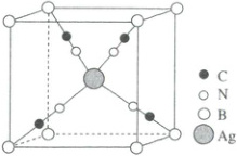 ,A错误;由题图可知,与Ag直接相连的原子有4个,晶胞中B位于顶点,个数为$8 × \frac{1}{8}=1$,与B直接相连的原子有4个,故Ag与B均为$\mathrm{sp^3}$杂化,B正确;晶体中与Ag最近且距离相等的Ag分别位于该晶胞上、下、前、后、左、右相邻6个晶胞的体心,C正确;Ag和B的最短距离为晶胞体对角线长的$\frac{1}{2}$,由题目信息知,该晶胞的密度为$d \ \mathrm{g · cm^{-3}}$,设晶胞参数为$a \ \mathrm{pm}$,由均摊法知,B位于晶胞的顶点,个数为$8 × \frac{1}{8}=1$,C、N、Ag均位于晶胞体内,个数分别为4、4、1,则该晶胞的密度=$\frac{ \frac{M(Ag_4C_4N_4B)}{} × 1}{ \left( a × 10^{-10} \mathrm{cm} \right)^3 × N_{\mathrm{A}} } = \frac{ \frac{223}{} × 10^{30}}{a^3 · N_{\mathrm{A}}} × 1 = d \ \mathrm{g · cm^{-3}}$,解得$a= \sqrt[3]{ \frac{223}{N_{\mathrm{A}}d}} × 10^{10}$,故Ag和B的最短距离为$\frac{\sqrt{3}}{2} × \sqrt[3]{ \frac{223}{N_{\mathrm{A}}d}} × 10^{10} \ \mathrm{pm}$,D正确。