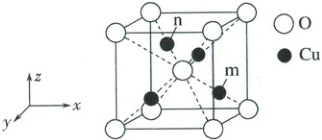 5.D 由图知,晶胞体心O原子距离最近的Cu原子数有4个,O的配位数为4,A正确;Cu与O的最近距离为体对角线的$\frac{1}{4}$,即$\frac{\sqrt{3}}{4}a \ \mathrm{pm}$,B正确;由m点的分数坐标为$(\frac{3}{4},\frac{1}{4},\frac{1}{4})$可知,n点在xyz轴投影坐标分别为$\frac{1}{4}$、$\frac{1}{4}$、$\frac{3}{4}$,分数坐标为$(\frac{1}{4},\frac{1}{4},\frac{3}{4})$,C正确;据“均摊法”,晶胞中含$8 × \frac{1}{8}+1=2$个O、4个Cu,则晶体密度为$\frac{2M}{a^3} × \frac{10^{30}}{N_{\mathrm{A}}} \ \mathrm{g · cm^{-3}}=\frac{2 × (128+16) × 10^{30}}{a^3 × N_{\mathrm{A}}} \ \mathrm{g · cm^{-3}}$,D错误;故选D。