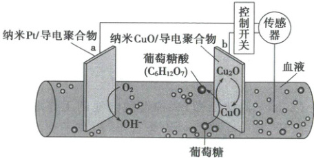 3.(2024·新课标卷)一种可植人体内的微型电池工作原理如图所示,通过$CuO$催化消耗血糖发电,从而控制血糖浓度。当传感器检测到血糖浓度高于标准,电池启动。血糖浓度下降至标准,电池停止工作。(血糖浓度以葡萄糖浓度计)