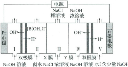 2. (2025·云南卷)一种用双极膜电渗析法卤水除硼的装置如图所示,双极膜中 H₂O 解离的 H⁺和 OH⁻在电场作用下向两极迁移。除硼原理:[B(OH)₄]⁻ + H⁺ = B(OH)₃ + H₂O。下列说法错误的是(