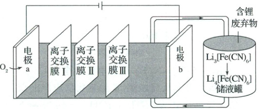 3.D 为实现海水的淡化,海水中Na⁺应通过离子交换膜I进入最左侧,为以LiCl形式回收锂元素,海水中Cl⁻应通过离子交换膜II向右侧迁移,Li⁺应通过离子交换膜III向左侧迁移,故离子交换膜II为阴离子交换膜,A错误;由阴极反应知,电极a附近溶液的pH增大,B错误;由上述分析知,C错误;每脱除58.5g(1mol)NaCl,溶液中有1molNa⁺、1molCl⁻和1molLi⁺迁移,所以可回收1molLiCl,D正确。