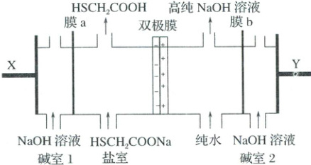 3.A 根据装置图,该装置为电解池装置,根据电解原理,左边电极为阴极,电极反应式为2H₂O + 2e⁻ = H₂↑ + 2OH⁻,HSCH₂COONa中Na⁺向阴极移动,膜a为阳离子交换膜,右边电极为阳极,电极反应式为4OH⁻ − 4e⁻ = O₂↑ + 2H₂O,碱室2中Na⁺向左移,膜b为阳离子交换膜。A项,膜a、b均为阳离子交换膜,故A正确;B项,双极膜解离出的H⁺在双极膜的左侧,故B错误;C项,碱室1和碱室2的NaOH溶液循环使用,副产品还有氢气和氧气,故C错误;D项,外电路有2mol电子通过,盐室中有2molNa⁺移向碱室1,双极膜中有2molH⁺移向盐室,即得到1molH₂SO₄,故D错误;故选A。
