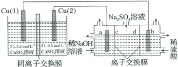 (2)电极为负极,电极反应式:Cu − 2e⁻ = Cu²⁺;则电解槽中a电极为阴极,b电极为阳极,阳极上水放电生成O₂和H⁺,电极反应式:2H₂O − 4e⁻ = O₂↑ + 4H⁺,阴极上水放电生成H₂,电极反应式:2H₂O + 2e⁻ = H₂↑ + 2OH⁻,则Na⁺通过离子交换膜c进入左室,c为阳离子交换膜,SO₄²⁻通过离子交换膜d进入右室,d为阴离子交换膜。b电极反应式为2H₂O − 4e⁻ = O₂↑ + 4H⁺,A正确;浓差电池中,Cu