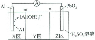 4.C X区Al失电子生成[Al(OH)₄]⁻,则Al电极为负极、PbO₂为正极,X区电解质为NaOH、Y区电解质为Na₂SO₄。电池工作时,负极反应:Al + 4OH⁻ − 3e⁻ = [Al(OH)₄]⁻,阴离子减少,Na⁺向正极移动,故m为阳离子交换膜;正极反应:PbO₂ + 2e⁻ + SO₄²⁻ + 4H⁺ = PbSO₄ + 2H₂O,溶液中负电荷大于正电荷,所以SO₄²⁻通过n膜向负极移动,n为阴离子交换膜。放电时,负极电极反应式为Al + 4OH⁻ − 3e⁻ = [Al(OH)₄]⁻,A错误;m为阳离子交换膜,n为阴离子交换膜,放电时,Z区SO₄²⁻通过n膜向Y区移动,B错误;放电时,消耗5.4gAl时,电路中通过0.6mol电子,Z区发生反应PbO₂ + 2e⁻ + SO₄²⁻ + 4H⁺ = PbSO₄ + 2H₂O,根据电荷守恒,同时有0.3molSO₄²⁻移入Y区,Z区消耗0.6molH₂SO₄,同时生成0.6mol水,电解质溶液质量减少48.0g,C正确;放电时,PbO₂转化为PbSO₄增重6.4g时,电路中转移0.2mol电子,有0.2molNa⁺、0.1molSO₄²⁻移入Y区,所以Y区离子数目增加了0.3N_A个,D错误。