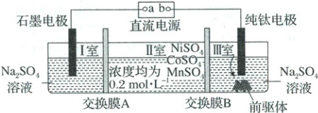 2.B 由图可知,前驱体在III室产生,即金属阳离子进入III室,与该极产生的OH⁻生成前驱体,纯钛电极反应式为2H₂O + 2e⁻ = H₂↑ + 2OH⁻,作为电解池的阴极,接电源负极(b),故a为正极,石墨电极为阳极,阳极电极反应式为2H₂O − 4e⁻ = 4H⁺ + O₂↑,发生氧化反应,II室中的阴离子通过交换膜A移向阳极,故交换膜A为阴离子交换膜。a是直流电源的正极,石墨电极为阳极,发生氧化反应,A错误;产生0.1mol的Ni₁/₃Co₁/₃Mn₁/₃(OH)₂时,需要0.2molOH⁻,纯钛电极反应为2H₂O + 2e⁻ = H₂↑ + 2OH⁻,产生0.1molH₂,标准状况下的体积为0.1mol×22.4L·mol⁻¹ = 2.24L,B正确;交换膜A是阴离子交换膜,交换膜B是阳离子交换膜,C错误;石墨电极为阳极,阳极电极反应式为2H₂O − 4e⁻ = 4H⁺ + O₂↑,则通电一段时间,I室pH减小,D错误。