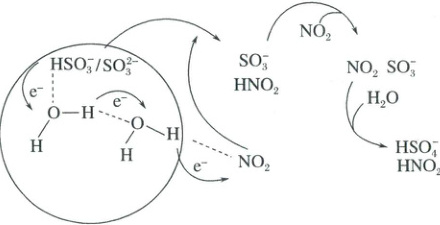 A.通过“水分子桥”,处于纳米液滴中的$SO_{3}^{2-}$或$HSO_{3}^{-}$可以将电子快速转移到周围的气相$NO_{2}$分子