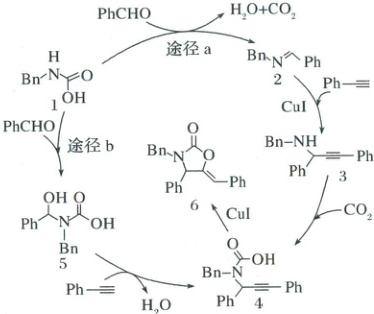 2. (2025·成都石室中学二模)某研究小组提出利用炔烃、醛、胺等工业大宗原料和炉烟二氧化碳的四组分串联反应,来实现恶唑烷酮及其衍生物的高效合成,反应历程如图所示。下列叙述正确的是(