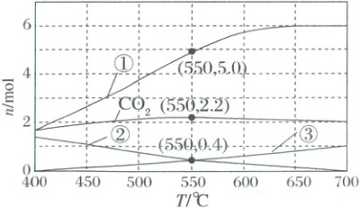 1.A起始时$C_{3}H_{8}O_{3}$的物质的量为$1mol$,故体系中$C$原子的物质的量为$3mol$,$550° C$时,曲线①对应物质的物质的量为$5mol$,则①为$H_{2}$;反应Ⅲ为放热反应,升温,逆向移动,$n(CH_{4})$减小,故②为$CH_{4}$,则③为$CO$;平衡体系中的含$H$物质有$C_{3}H_{8}O_{3}$、$H_{2}$、$H_{2}O$、$CH_{4}$,含$C$物质有$C_{3}H_{8}O_{3}$、$CH_{4}$、$CO$、$CO_{2}$,根据$C$元素守恒有:$1mol×3=3n(C_{3}H_{8}O_{3})+n(CH_{4})+n(CO)+n(CO_{2})$,根据$H$元素守恒有:$1mol×8+9mol×2=8n(C_{3}H_{8}O_{3})+4n(CH_{4})+2n(H_{2})+2n(H_{2}O)$,两式联立可得$n(H_{2}O)=7.2mol$,故$550° C$时,$H_{2}O$的平衡转化率为$\frac{9 - 7.2}{9}×100\%=20\%$,A正确;由题图知,$550° C$反应达到平衡时,$n(CO_{2}):n(CO)=11:2$,B错误;其他条件不变,在$400\sim550° C$范围内,升高温度,反应Ⅰ的平衡正向移动,反应Ⅱ和Ⅲ的平衡逆向移动,$CO_{2}$的物质的量增加,说明反应Ⅲ的平衡逆向移动的程度大于反应Ⅱ,故平衡时$H_{2}O$的物质的量随温度升高而减小,C错误;反应Ⅰ是气体分子数增大的反应,反应Ⅱ是气体分子数不变的反应,反应Ⅲ是气体分子数减小的反应,其他条件不变,增大压强,反应Ⅰ的平衡逆向移动,反应Ⅱ的平衡不移动,反应Ⅲ的平衡正向移动,平衡时$H_{2}$的物质的量减小,故D错误。