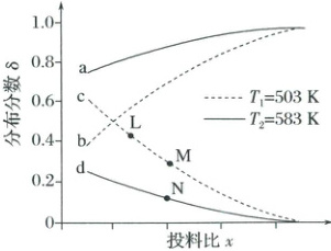 明确指出,图中曲线表示的是测得两种含碳产物的分布分数即分别为$\delta(CH_{3}COOH)$、$\delta(CH_{3}COOCH_{3})$,若投料比$x$代表$\frac{n(CH_{3}OH)}{n(CO)}$,$x$越大,可看作是$CH_{3}OH$的量增多,则对于主、副反应可知生成的$CH_{3}COOCH_{3}$越多,$CH_{3}COOCH_{3}$分布分数越高,则曲线a或曲线b表示$CH_{3}COOCH_{3}$分布分数,曲线c或曲线d表示$CH_{3}COOH$分布分数,据此分析可知AB均正确,可知如此假设错误,则可知投料比$x$代表$\frac{n(CO)}{n(CH_{3}OH)}$,曲线a或曲线b表示$\delta(CH_{3}COOH)$,曲线c或曲线d表示$\delta(CH_{3}COOCH_{3})$。A项,投料比$x$代表$\frac{n(CO)}{n(CH_{3}OH)}$,故A错误;B项,曲线c表示$CH_{3}COOCH_{3}$分布分数,故B错误;C项,曲线a或曲线b表示$\delta(CH_{3}COOH)$,当同一投料比时,观察图像可知$T_{2}$时$\delta(CH_{3}COOH)$大于$T_{1}$时$\delta(CH_{3}COOCH_{3})$,而$T_{2}>T_{1}$可知,温度越高则$\delta(CH_{3}COOH)$越大,说明温度升高主反应的平衡正向移动,$\Delta H_{1}>0$;曲线c或曲线d表示$\delta(CH_{3}COOCH_{3})$,当同一投料比时,观察可知$T_{1}$时$\delta(CH_{3}COOCH_{3})$大于$T_{2}$时$\delta(CH_{3}COOCH_{3})$,而$T_{2}>T_{1}$可知,温度越高则$\delta(CH_{3}COOCH_{3})$越小,说明温度升高副反应的平衡逆向移动,$\Delta H_{2}<0$,故C错误;D项,$L$、$M$、$N$三点对应副反应$\Delta H_{2}<0$,且$T_{N}>T_{M}=T_{L}$,升高温度平衡逆向移动,$K(L)=K(M)>K(N)$,故D正确;故选D。