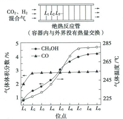 225℃、8×10⁶ Pa下,将一定比例CO₂、H₂混合气匀速通过装有催化剂的绝热反应管。装置及L₁、L₂、L₃…位点处(相邻位点距离相同)的气体温度、CO和CH₃OH的体积分数如图所示。下列说法正确的是(