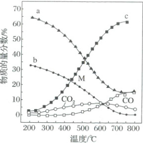 3.D生成$CH_{4}$的反应是放热反应,升高温度,$CH_{4}$减少,$H_{2}$增多,$H_{2}O$减少,且根据方程式,$H_{2}O$的量多于$CH_{4}$,故a为$H_{2}O$,b为$CH_{4}$,c为$H_{2}$,A错误;温度低于$500° C$时,$CO$的物质的量分数约为$0$,说明$CO$几乎完全反应,反应越完全,化学平衡常数越大,则此条件下,反应ⅱ化学平衡常数大,反应完全,B错误;反应$CO_{2}(g)+4H_{2}(g)\rightleftharpoons CH_{4}(g)+2H_{2}O(g)\ \ \Delta H=-205kJ· mol^{-1}$,C错误;起始时,$\frac{n(H_{2})}{n(CO_{2})}=4$,设$CO_{2}$的加入量为$1mol$,$H_{2}$的加入量为$4mol$,$CO_{2}$的反应量为$xmol$,平衡时$H_{2}$的物质的量为$(4 - 4x)mol$,$CH_{4}$的物质的量为$xmol$,$M$点时$CH_{4}$和$H_{2}$的物质的量相等,故$4 - 4x=x$,解得$x=0.8$,则平衡时$CO_{2}$、$H_{2}$、$CH_{4}$、$H_{2}O$的物质的量分别为$0.2mol$、$0.8mol$、$0.8mol$、$1.6mol$,混合气体的总物质的量为$0.2mol+0.8mol+0.8mol+1.6mol=3.4mol$,起始时$p=1atm$,则有$\frac{5mol}{3.4mol}=\frac{1atm}{p_{平}}$,解得平衡时压强$p_{平}=\frac{3.4}{5}atm$,平衡分压$p(CO_{2})=\frac{0.2mol}{3.4mol}×\frac{3.4}{5}atm=0.04atm$,$p(H_{2})=\frac{0.8mol}{3.4mol}×\frac{3.4}{5}atm=0.16atm$,$p(CH_{4})=\frac{0.8mol}{3.4mol}×\frac{3.4}{5}atm=0.16atm$,$p(H_{2}O)=\frac{1.6mol}{3.4mol}×\frac{3.4}{5}atm=0.32atm$,反应$CO_{2}(g)+4H_{2}(g)\rightleftharpoons CH_{4}(g)+2H_{2}O(g)$的平衡常数$K_{p}=\frac{p(CH_{4})· p^{2}(H_{2}O)}{p(CO_{2})· p^{4}(H_{2})}=\frac{0.16atm×(0.32atm)^{2}}{0.04atm×(0.16atm)^{4}}=625atm^{-2}$,D正确。