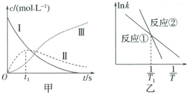 4. (2025·河南部分高中二模)恒温恒容条件下,向密闭容器中加入一定量X,发生反应①X = Y、②Y = Z。反应①的速率v₁ = k₁c(X),反应②的速率v₂ = k₂c(Y),式中k₁、k₂为速率常数。图甲为该体系中X、Y、Z浓度随时间变化的曲线,图乙为反应①和②的ln k~$\frac{1}{T}$关系曲线。下列说法错误的是(
