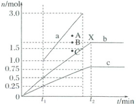 在$T_{1}^{\circ}C$、$p_{1}\ kPa$的恒压密闭容器中,按物质的量之比为$1:2$通入${CH_{3}CH_{2}CH_{2}CH_{3}(g)}$和${N_{2}(g)}$的混合气体,发生上述反应,测得生成物的物质的量与反应时间关系曲线如图所示(曲线a只表示某物质的部分变化)。