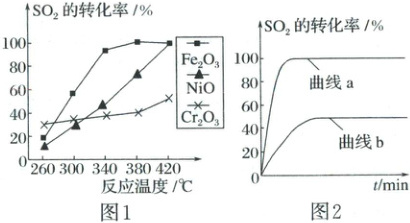 (1) 其他条件相同、催化剂不同,$ SO_2 $ 的转化率随反应温度的变化如图 1,$ Fe_2O_3 $ 和 $ NiO $ 作催化剂均能使 $ SO_2 $ 的转化率达到最高,不考虑催化剂价格因素,选择 $ Fe_2O_3 $ 的主要优点是