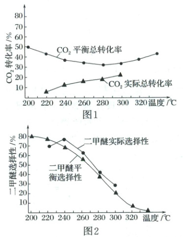 (2) 图 2 中,在 $ 240 \sim 300^{\circ}C $ 范围内,相同温度下,二甲醚的实际选择性高于其平衡值,从化学反应速率的角度解释原因: ______。