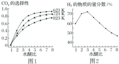$ CO_2 $ 的选择性 ($ \frac{产生 \, CO_2 \, 的物质的量}{产生 \, CO \, 和 \, CO_2 \, 的总物质的量} $) 与水醚比 $ [\frac{n(H_2O)}{n(CH_3OCH_3)}] $ 和温度的关系如图 1 所示;423 K 时,平衡时 $ H_2 $ 的物质的量分数与水醚比的关系如图 2 所示: