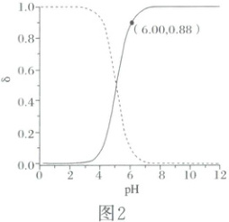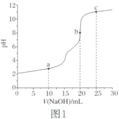 1.D 由图1中的信息可知,当加入NaOH标准溶液的体积为20.00mL时到达滴定终点,由关系式$4NH_4^+\sim[(CH_2)_6N_4H^++3H^+]\sim4OH^-$可知,由于待测液的体积和标准溶液的体积相同,因此,浓缩后的20.00mL溶液中$c(NH_4^+)=c(OH^-)=0.01000mol· L^{-1}$,则原废水中$c(NH_4^+)=0.01000mol· L^{-1}×\frac{1}{10}=0.001000mol· L^{-1}$,因此,废水中$NH_4^+$的含量为$0.001000mol×18000mg· mol^{-1}· L^{-1}=18mg· L^{-1}$,A错误;c点加入NaOH标准溶液的体积过量,且只过量了$\frac{1}{5}$,由电荷守恒可知,$c[(CH_2)_6N_4H^+]+c(H^+)+c(Na^+)=c(OH^-)+c(Cl^-)$,浓缩后的废水中$NH_4Cl$的浓度是NaOH标准溶液浓度的4倍,$Cl^-$和$Na^+$均不参与离子反应,可以估算$c(Cl^-)>c(Na^+)$,$c[(CH_2)_6N_4H^+]+c(H^+)>c(OH^-)$,B错误;$(CH_2)_6N_4H^+$在溶液中水解使溶液显酸性,类比$NH_3$可知$(CH_2)_6N_4$在溶液中与水作用发生电离而使溶液显碱性;a点为半滴定点,由其纵坐标可知溶液显酸性,说明$(CH_2)_6N_4H^+$的水解作用强于$(CH_2)_6N_4$的电离作用,可知溶液中相关粒子的浓度的大小关系为$c[(CH_2)_6N_4]>c[(CH_2)_6N_4H^+]$,C错误;由图1和图2可知,当$pH=6.00$时,$(CH_2)_6N_4$占比较高,$\delta[(CH_2)_6N_4]=0.88$,则由氮元素守恒可知,$\delta[(CH_2)_6N_4H^+]=0.12$,两种粒子的浓度之比等于其分布分数之比,则$(CH_2)_6N_4H^+\rightleftharpoons (CH_2)_6N_4+H^+$的平衡常数$K=\frac{c[(CH_2)_6N_4]· c(H^+)}{c[(CH_2)_6N_4H^+]}=\frac{0.88×10^{-6}}{0.12}\approx7.3×10^{-6}$,D正确;综上所述,本题选D。