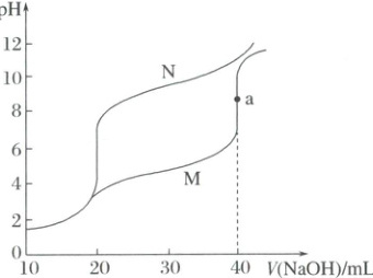 2.D 溶液中加入40mL氢氧化钠溶液时,Ⅰ中的溶质为氯化钠和醋酸钠,Ⅱ中的溶质为氯化钠和一水合氨,根据$K_a(CH_3COOH)=K_b(NH_3· H_2O)=1.8×10^{-5},$醋酸根离子、铵根离子的水解程度小于醋酸、一水合氨的电离程度,氯化钠显中性,醋酸根离子和一水合氨在浓度相同时,一水合氨溶液的碱性更强,故Ⅰ对应的滴定曲线为M,Ⅱ对应的滴定曲线为N。A项,向溶液中加入40mL氢氧化钠溶液时,Ⅰ中的溶质为氯化钠和醋酸钠,Ⅱ中的溶质为氯化钠和一水合氨,氯化钠显中性,醋酸根离子和一水合氨在浓度相同时,一水合氨溶液的碱性更强,故Ⅰ对应的滴定曲线为M,A错误;B项,a点的溶质为氯化钠和醋酸钠,醋酸根离子发生水解,溶液的pH接近8,由水电离的c(H^+)=c(OH^-),数量级接近$10^{-6},$B错误;C项,当V(NaOH)=30.00mL时,Ⅱ中的溶质为氯化钠、氯化铵、一水合氨,且氯化铵和一水合氨的浓度相同,铵根离子的水解$K_h=\frac{K_w}{K_a}=\frac{10^{-14}}{1.8×10^{-5}}=5.6×10^{-10}$<1.8×10^{-5},即NH_4^+水解程度小于一水合氨的电离程度,所以c(NH_4^+)>$c(NH_3· H_2O),$又元素质量守恒$c(Cl^-)=2c(NH_4^+)+2c(NH_3· H_2O),$即$c(Cl^-)>c(NH_4^+)>c(NH_3· H_2O),$C错误;D项,根据元素质量守恒,$n(CH_3COO^-)、$$n(CH_3COOH)$之和等于$n(NH_3· H_2O)、$$n(NH_4^+)$之和,根据图像,pH=7时,Ⅱ所加氢氧化钠溶液较少,溶液体积较小,故Ⅰ中$c(CH_3COO^-)、$$c(CH_3COOH)$之和小于Ⅱ中$c(NH_3· H_2O)、$$c(NH_4^+)$之和,D正确;故选D。