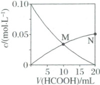 3.D 结合起点和终点,向$20mL0.10mol· L^{-1}NaOH$溶液中滴入相同浓度的HCOOH溶液,发生浓度改变的微粒是$Na^+$、$OH^-$、$H^+$和$HCOO^-$;当$V(HCOOH)=0mL$时,溶液中存在$Na^+$、$H^+$和$OH^-$,$c(OH^-)=c(Na^+)=0.10mol· L^{-1}$,随着加入HCOOH溶液,$c(Na^+)$减少但不会降到0,当$V(HCOOH)=20mL$时,$c(Na^+)=0.05mol· L^{-1}$,随着加入HCOOH溶液,$c(OH^-)$会与HCOOH反应而减少,溶质由NaOH变为NaOH和HCOONa混合物,最终为HCOONa,$c(H^+)$增加得很少,而$c(HCOO^-)$增加得多,当$V(HCOOH)=20mL$时,溶质为HCOONa,$HCOO^-$少部分水解,$c(HCOO^-)<0.05mol· L^{-1}$,斜率为正的曲线代表$c(HCOO^-)$,即经过M点在下降的曲线表示的是$OH^-$浓度的改变,经过M点、N点的在上升的曲线表示的是$HCOO^-$浓度的改变。N点HCOOH溶液与NaOH溶液恰好反应生成HCOONa,此时仅存在HCOONa的水解,M点时仍剩余有未反应的NaOH,对水的电离产生抑制,故水的电离程度:M<N,A正确;M点溶液中电荷守恒有$c(Na^+)+c(H^+)=c(HCOO^-)+c(OH^-)$,M点$c(HCOO^-)=c(OH^-)$,联立可得$2c(OH^-)=c(Na^+)+c(H^+)$,B正确;当$V(HCOOH)=10mL$时,溶液中的溶质为$c(NaOH):c(HCOONa)=1:1$,根据电荷守恒有$c(Na^+)+c(H^+)=c(HCOO^-)+c(OH^-)$,根据元素守恒$c(Na^+)=2c(HCOO^-)+2c(HCOOH)$,两式整理可得$c(OH^-)=c(H^+)+2c(HCOOH)+c(HCOO^-)$,C正确;N点HCOOH溶液与NaOH溶液恰好反应生成HCOONa,HCOO^-发生水解,因此$c(Na^+)>c(HCOO^-)$及$c(OH^-)>c(H^+)$,观察图中N点可知,$c(HCOO^-)\approx0.05mol· L^{-1}$,根据$K_a(HCOOH)=\frac{c(H^+)· c(HCOO^-)}{c(HCOOH)} =1.8×10^{-4}$,可知$c(HCOOH)>c(H^+)$,D错误。