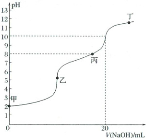 1.C 由图可知,用NaOH溶液滴定氯水,滴定过程中有两个突变点,则从甲到乙,主要发生HCl与NaOH的反应;从乙到pH=10的点,主要发生HClO与NaOH的反应。由图可知,加入20mL氢氧化钠溶液恰好生成氯化钠和次氯酸钠,结合元素质量守恒,氯原子总量为$0.1mol· L^{-1}×0.02L=0.002mol$,据此解答。氯水中的次氯酸具有强氧化性,则氯水具有漂白性,玻璃棒蘸取该溶液滴至pH试纸上会先变色后褪色,所以该实验过程不可以用pH试纸测量溶液的pH值,A错误;由分析可知,结合氯元素守恒,甲点溶液中存在:$2n(Cl_2)+n(HClO)+n(Cl^-)+n(ClO^-)=0.002N_A$,B错误;丙点溶液中含有NaCl、NaClO、HClO,此时$c(H^+)=10^{-8}mol/L$,则$K_a=\frac{c(H^+)c(ClO^-)}{c(HClO)}=\frac{10^{-8}c(ClO^-)}{c(HClO)}=2.5×10^{-8}$,$c(ClO^-)=2.5c(HClO)$,结合反应$Cl_2+H_2O\rightleftharpoons HClO+HCl$,则$c(Cl^-)=c(ClO^-)+c(HClO)$,所以丙点溶液中:$c(Na^+)>c(Cl^-)>c(ClO^-)>c(HClO)>c(H^+)$,C正确;氯水中存在平衡:$Cl_2(aq)+H_2O(l)\rightleftharpoons H^+(aq)+Cl^-(aq)+HClO(aq)$,pH=10时,$Cl_2$与NaOH刚好完全反应,由$Cl_2+2NaOH=NaCl+NaClO+H_2O$,可求出$c(Cl_2)=\frac{0.1mol· L^{-1}×0.02L×\frac{1}{2}}{0.01L}=0.1mol/L$,根据起点pH=2,有$c(H^+)=c(Cl^-)=c(HClO)=0.01mol/L$,此时$c(Cl_2)=0.1-c(H^+)$,其平衡常数$K=\frac{c(H^+)c(Cl^-)c(HClO)}{c(Cl_2)}=\frac{0.01×0.01×0.01}{0.1-0.01}\approx10^{-5}$,即该反应的平衡常数K的数量级为$10^{-5}$,错误;故选C。