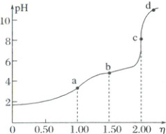 2.D NaOH溶液和HCl、$CH_3COOH$混酸反应时,先与强酸反应,然后再与弱酸反应,由滴定曲线可知,a点时NaOH溶液和HCl恰好完全反应生成NaCl和水,$CH_3COOH$未发生反应,溶质成分为NaCl和$CH_3COOH$;b点时NaOH溶液反应掉一半的$CH_3COOH$,溶质成分为NaCl、$CH_3COOH$和$CH_3COONa$;c点时NaOH溶液与$CH_3COOH$恰好完全反应,溶质成分为NaCl、$CH_3COONa$;d点时NaOH过量,溶质成分为NaCl、$CH_3COONa$和NaOH,据此解答。由分析可知,a点时溶质成分为NaCl和$CH_3COOH$,$c(CH_3COOH)=0.0100mol/L$,$c(H^+)=c(CH_3COO^-)$,则$K_a=\frac{c(H^+)c(CH_3COO^-)}{c(CH_3COOH)}=\frac{c^2(H^+)}{0.01}=10^{-4.76}$,$c(H^+)=\sqrt{10^{-6.76}}=10^{-3.38}(mol· L^{-1})$,$pH=3.38$,故A正确;点b溶液中含有NaCl及等浓度的$CH_3COOH$和$CH_3COONa$,由于$pH<7$,溶液显酸性,说明$CH_3COOH$的电离程度大于$CH_3COO^-$的水解程度,则$c(CH_3COOH)<c(CH_3COO^-)$,故B正确;由分析可知,c点时溶质成分为NaCl、$CH_3COONa$,且浓度比为1:1,根据元素质量守恒:$c(Na^+)=2c(CH_3COOH)+2c(CH_3COO^-)$,故C正确;pH=7时$c(H^+)=c(OH^-)$,则根据电荷守恒:$c(Na^+)=c(Cl^-)+c(CH_3COO^-)$,故D错误;故答案为D。